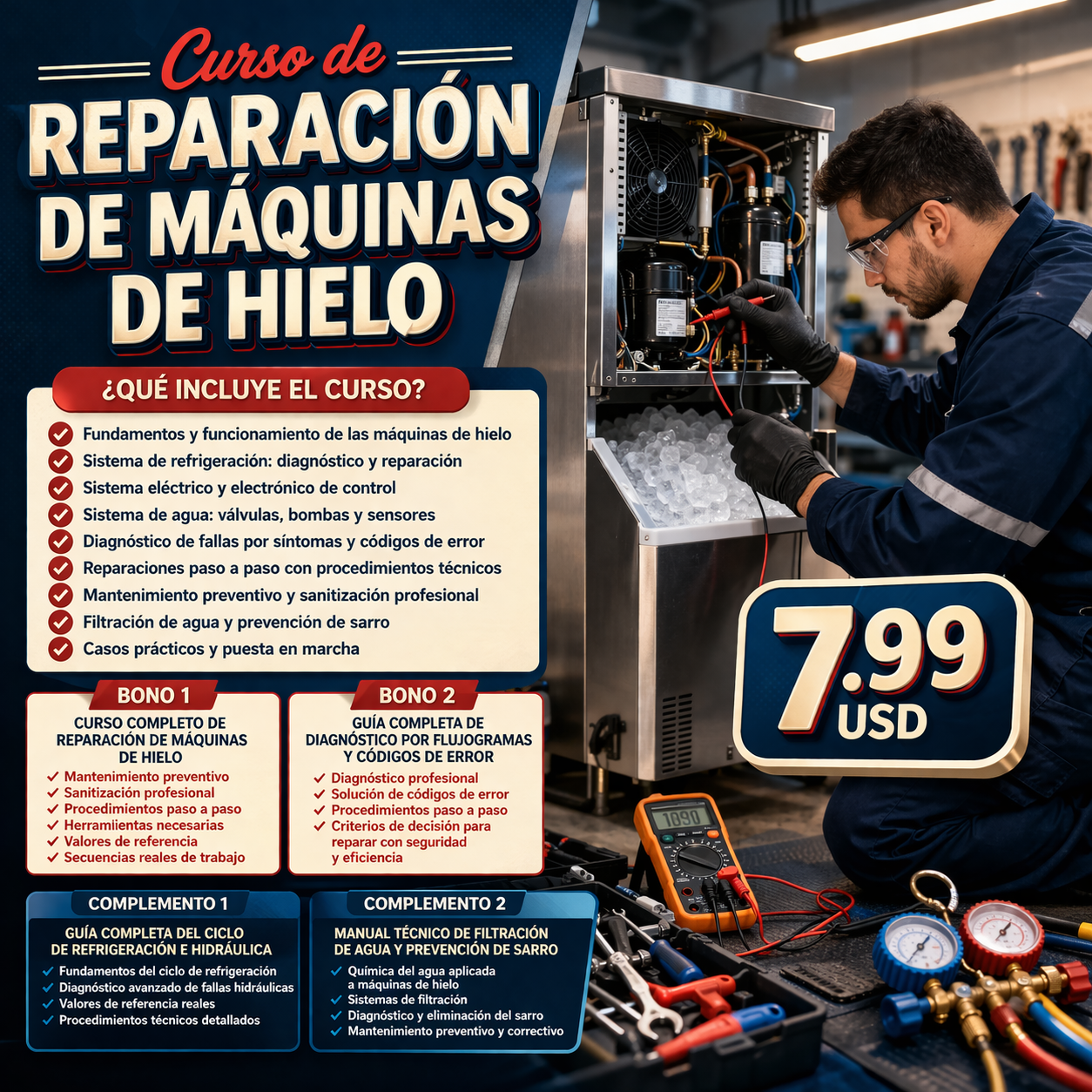 Hoy tienes la posibilidad de acceder a una formación técnica completa sobre máquinas de hielo por el precio más bajo que tendrá este material. Esta oferta de lanzamiento de $7.99 USD es válida solo por hoy. Mañana el precio sube de vuelta a $50.00 USD sin previo aviso.